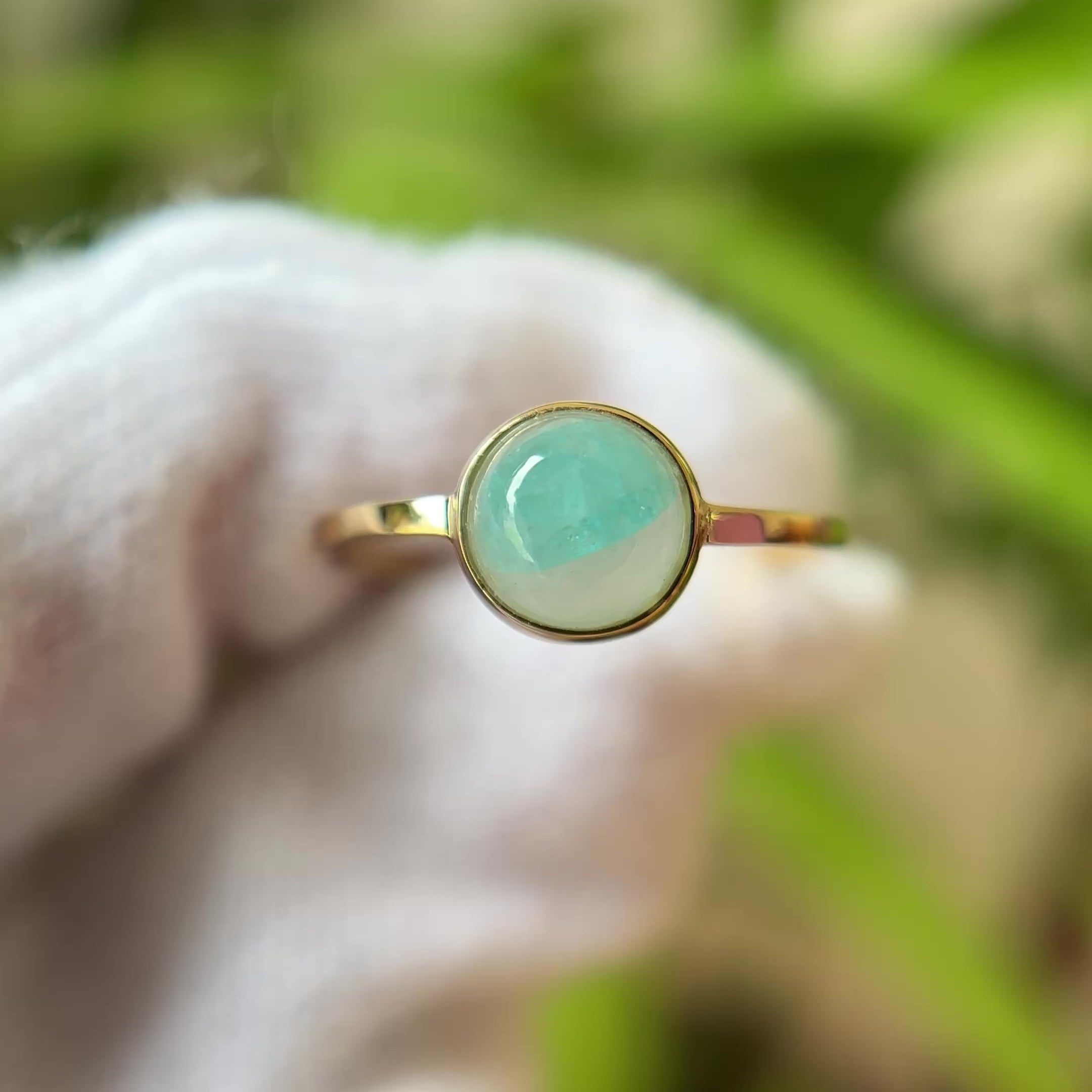 ネオンブルーのパライバカラーと、透明感のあるミルキーホワイトが重なり合ったカボションカットは、