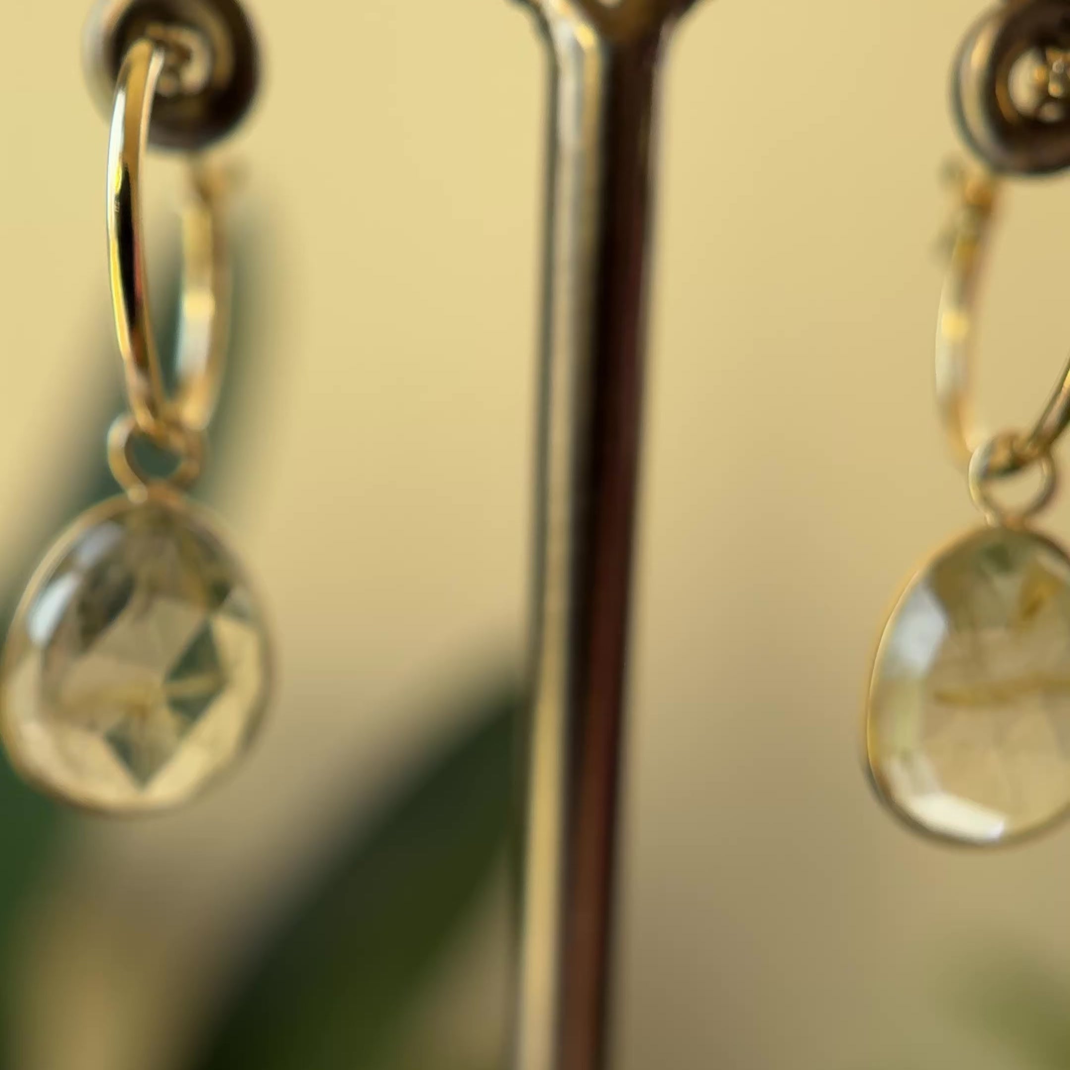 うるうるとした煌めきの中に、金色のルチルの針が繊細な輝きを添え、耳元を上品に彩ります。