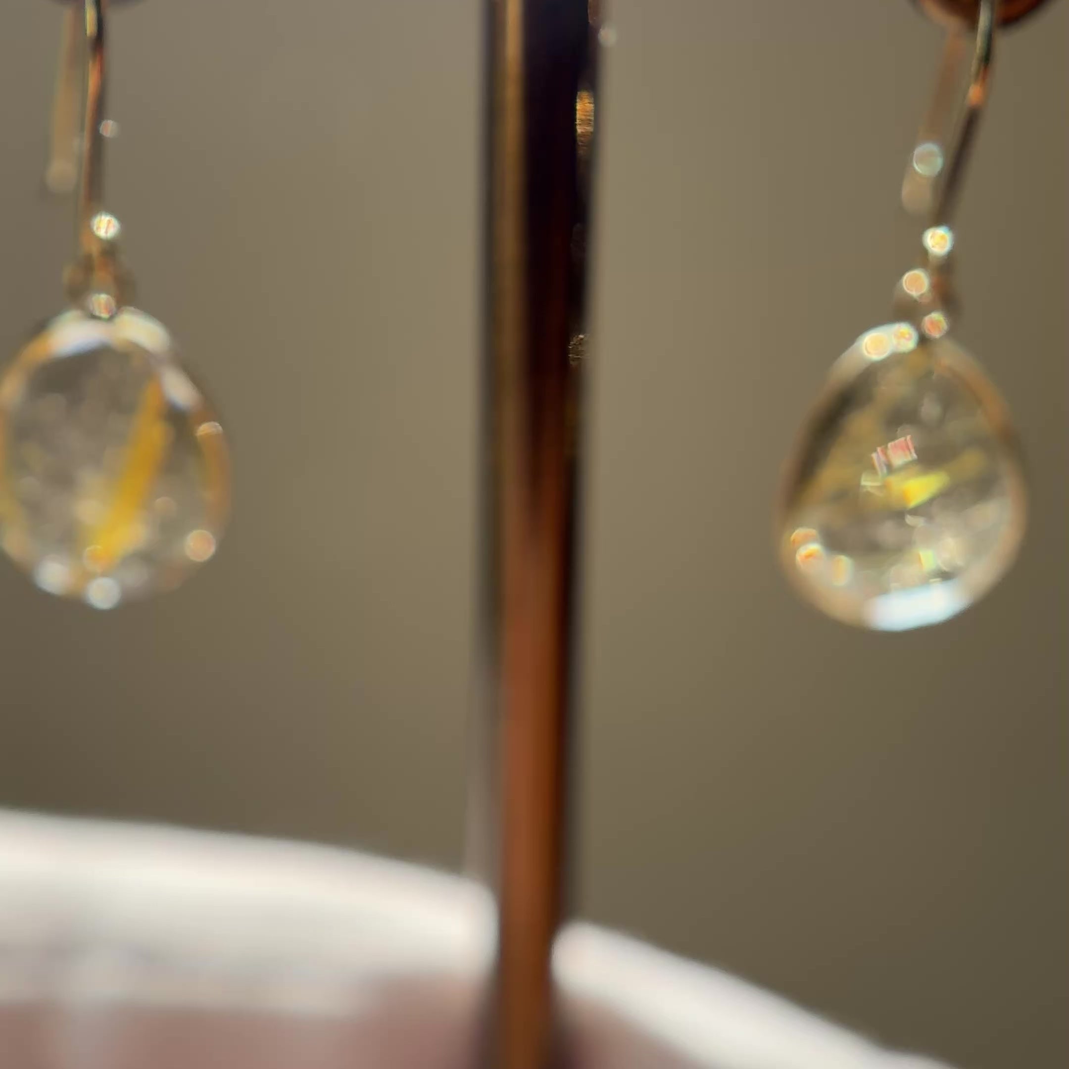 うるうるとした煌めきの中に、金色のルチルの針が繊細な輝きを添え、耳元を上品に彩ります。