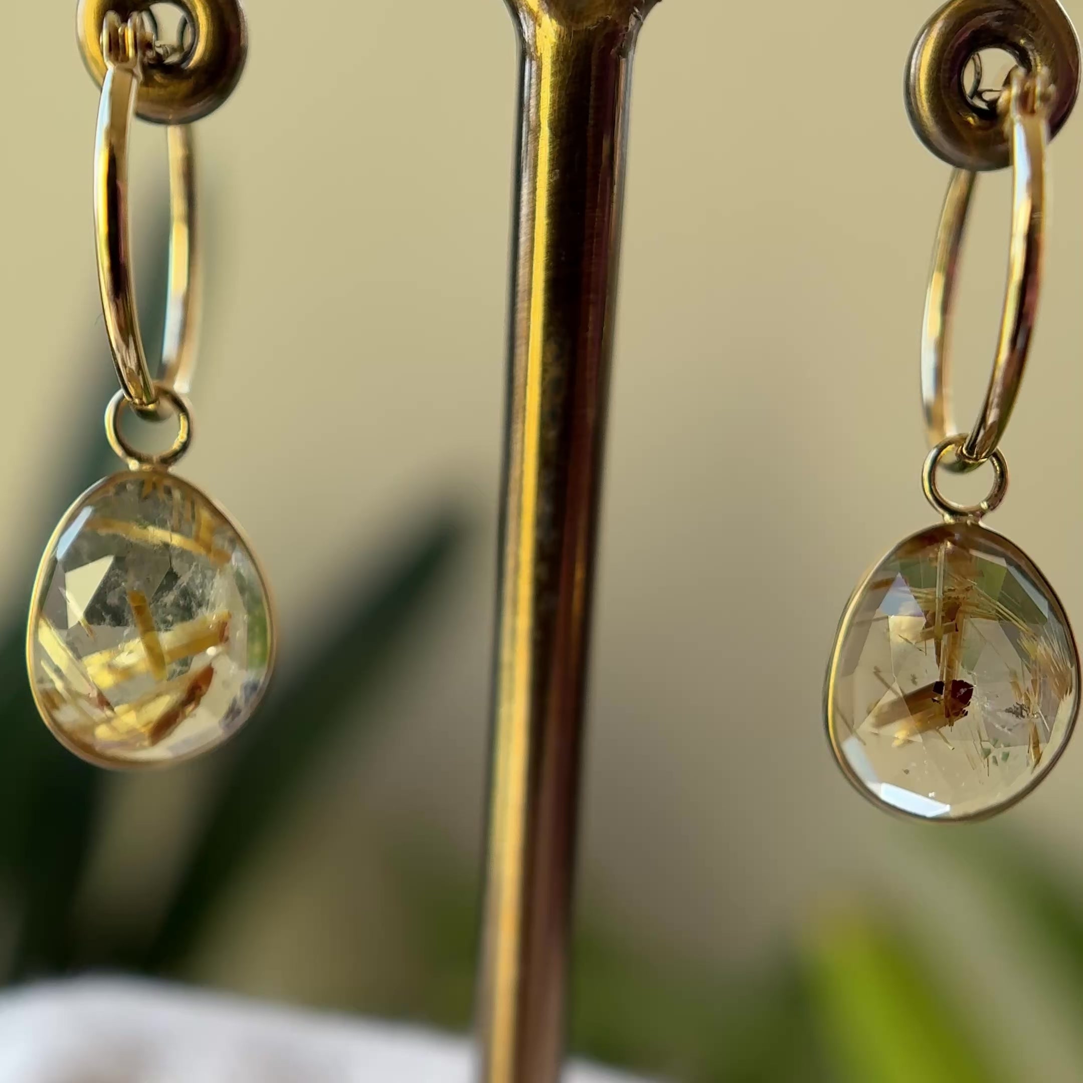 うるうるとした煌めきの中に、金色のルチルの針が繊細な輝きを添え、耳元を上品に彩ります。