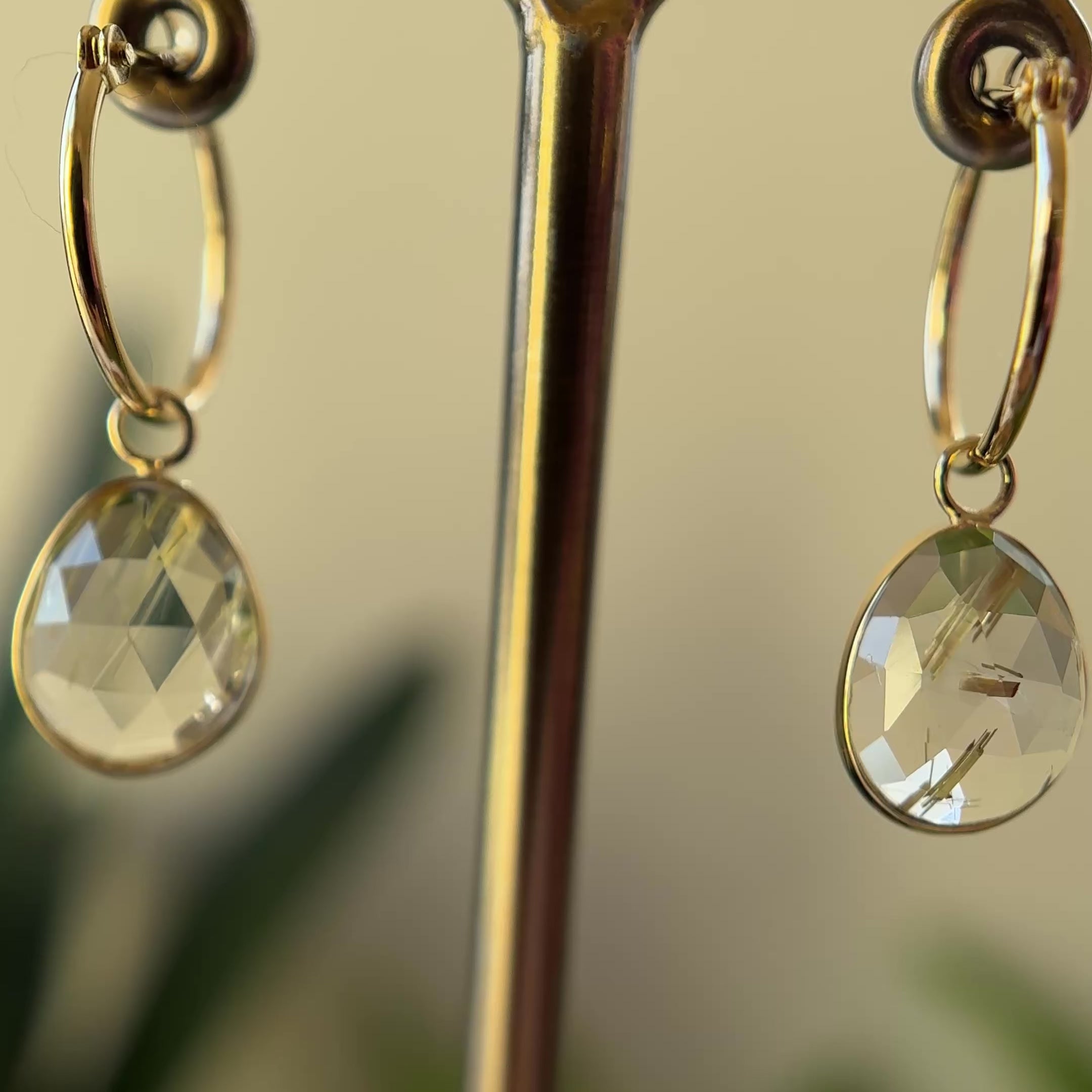 うるうるとした煌めきの中に、金色のルチルの針が繊細な輝きを添え、耳元を上品に彩ります。