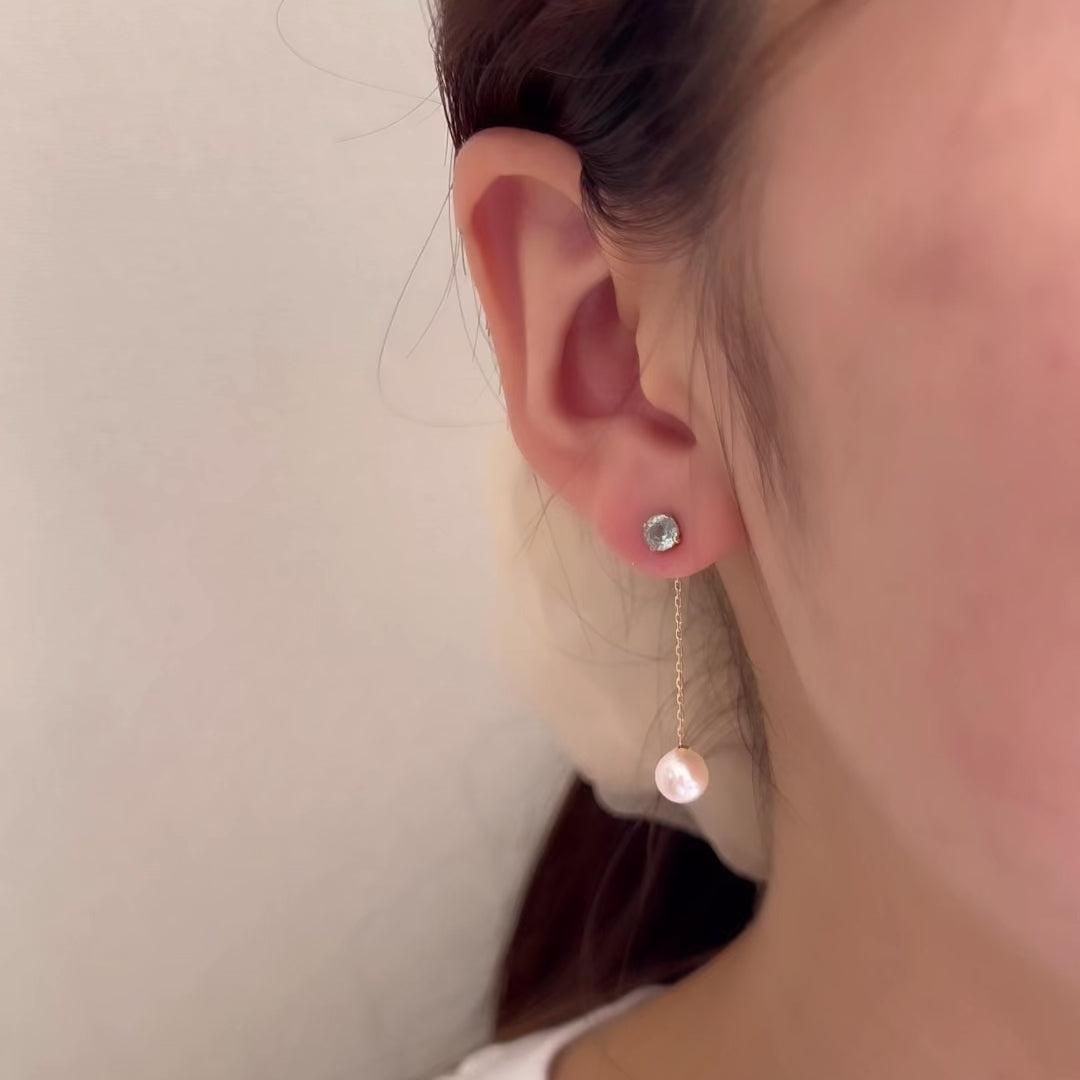 耳の後ろからチェーンが垂れ下がり、ピアスを華やかに見せてくれます